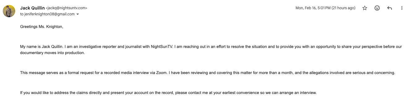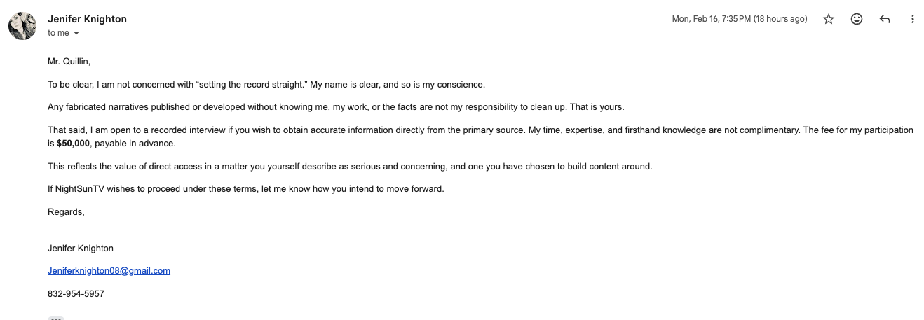 On February 16, 2026, NightSunTV journalist Jack Quillin contacted Knighton seeking comment and clarification regarding serious allegations involving child and human trafficking. In her written reply, Knighton stated: