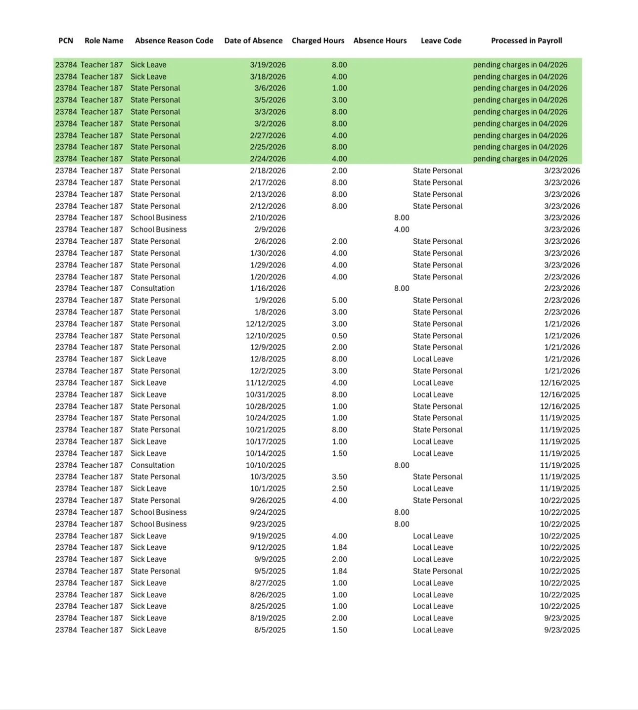 Separate records detail multiple instances of sick leave and personal leave taken during the same timeframe as campaign activity. The key issue identified is whether the leave was properly approved and whether it was used for its stated purpose. Allegations assert that misuse of sick leave could constitute administrative violations or potential falsification of leave records, depending on findings.
