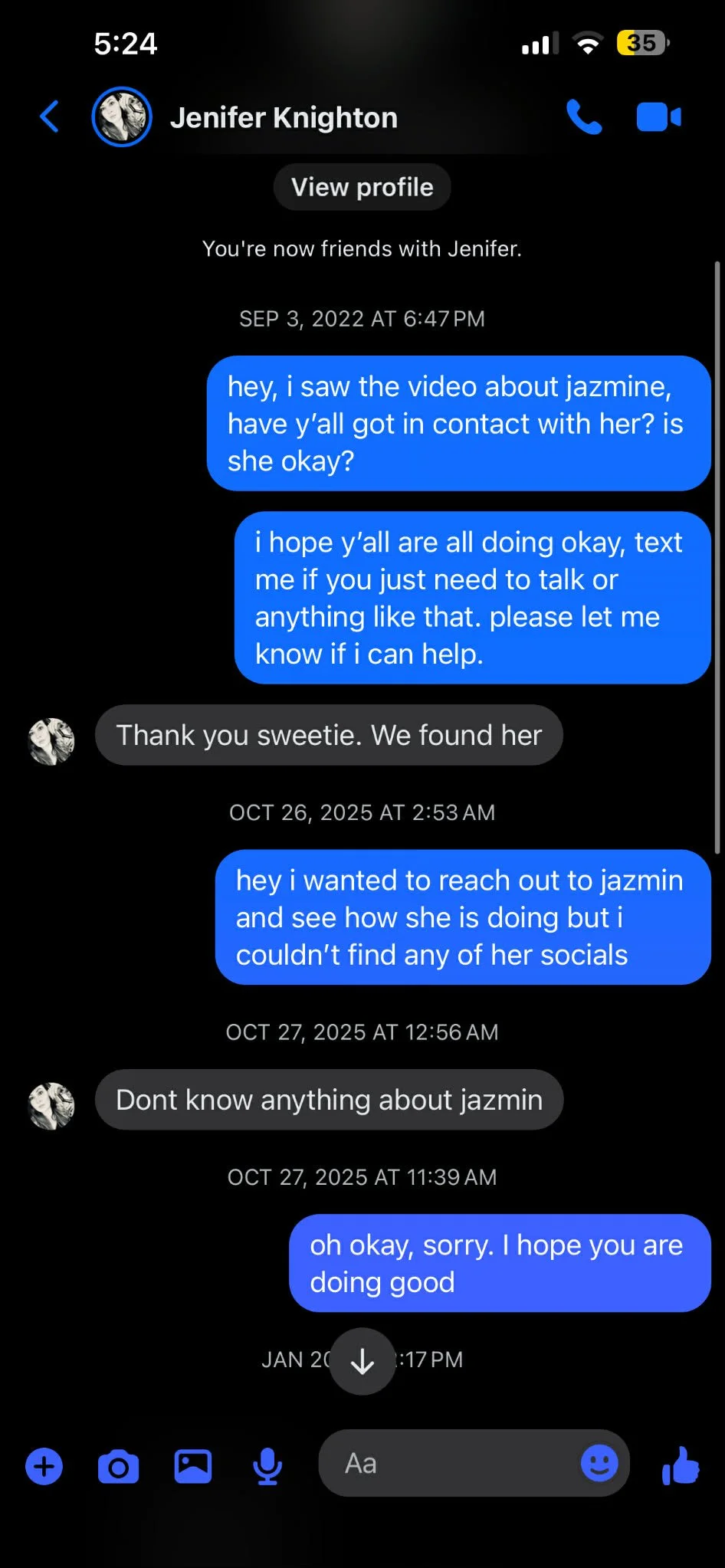 Screenshots of online messages have added to the confusion. On September 3, 2022, Jenifer Knighton responded to an inquiry about Jazmin Perez by stating, “We found her.” In October 2025, when asked again about Perez, Knighton replied that she did not know anything about her.