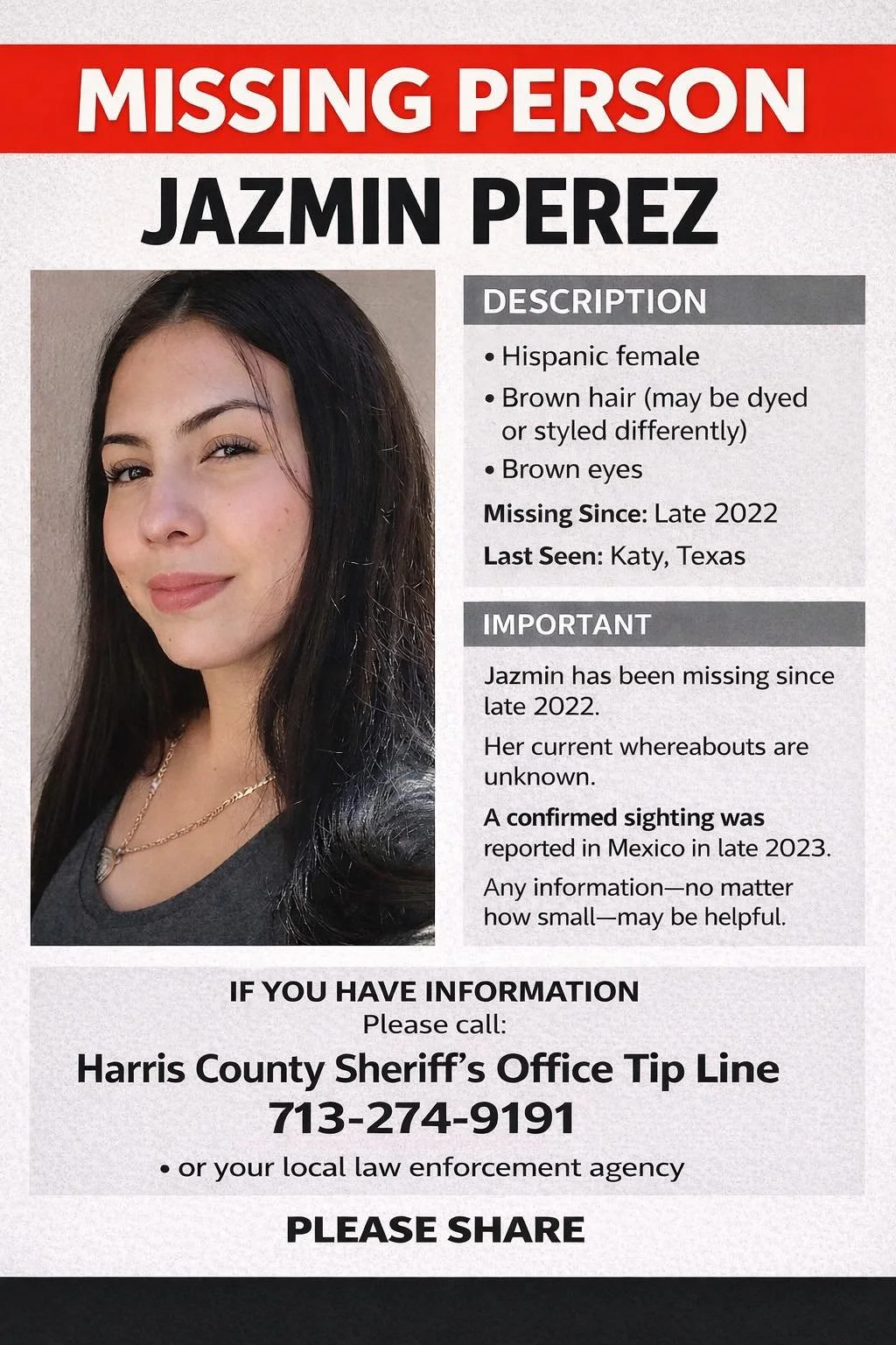 Anyone with verified information regarding Jazmin Perez’s status is urged to contact the Harris County Sheriff’s Office Tip Line at 713-274-9191.